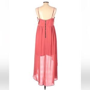 Fetching pink hi low dress featuring sweetheart bustline, adjustable straps, and exposed back zip closure. Bust is lightly padded and there are no pockets. Empire waist does not have much stretch, but there is elastic in back for a nice fit in the bust. Chiffon over a silky soft mini dress liner.
