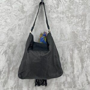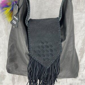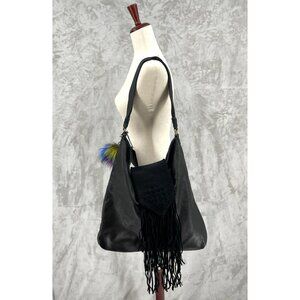 Margot Black Full Grain Leather Suede Fringe Large Hobo Shoulder Bag Boho