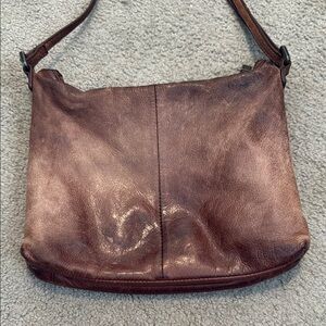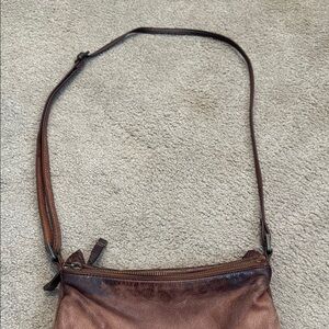 The Margot crossbody bag showcases a rich brown leather finish with a vintage appeal. Its slouchy, crescent shape and soft, pliable leather make it a stylish and practical choice for everyday use. The natural patina and wear patterns add character, ensuring each bag is unique. Dual zipper compartments.  Clean inside and out.  No rips or stains.