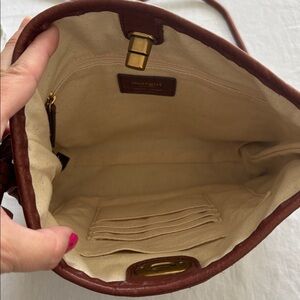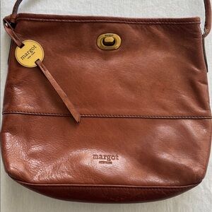 Pre owned. Buttery soft leather Margot crossbody or shoulder purse. Crafted from rich brown leather. Interior is cream canvas with a zipper pocket on one side and an open pocket and card slots on the other side. Perfect for every day use. See pictures for details and condition.