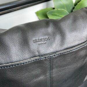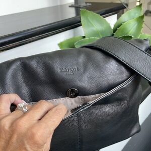 Elegant black crossbody bag. Soft leather texture. Convenient front zipper pocket.