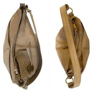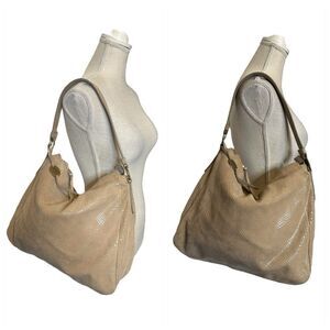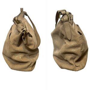 Margot NY Leather Reptile Print Hobo Shoulder Bag. Features a slouchy hobo style with a gorgeous replies print in a neutral taupe/tan. Interior is a lined with a cream colored cotton linen. 2 interior slide pockets, 1 zip pocket.