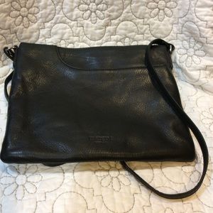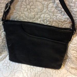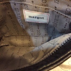 Margot black leather adjustable crossbody strap, large slip outside pocket, inside slip pocket, zipper closure, silver hardware, very nice gently used, slim stylish bag