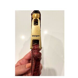 Beautiful Margot New York leather wristlet wallet in a rich burgundy tone. Made of genuine pebbled leather with a snap-tab closure and zippered compartment for secure storage.