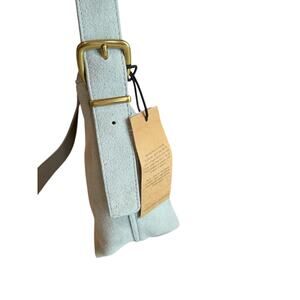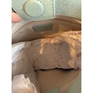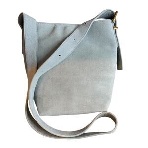 New Margot New York Kaye Mini Bucket Tote Bag in Suede, color is a light blue.