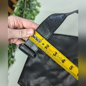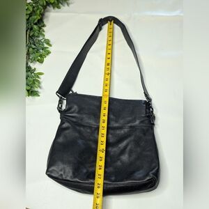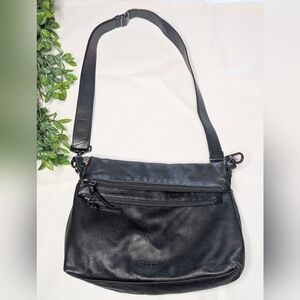 Margot black leather bag featuring multiple different compartments that zip or magnet closed and fold over side of bag. Adjustable crossbody shoulder strap. Overall gently used with a few very faint scuffs as shown in last closeup photo. Please see photos for measurements.