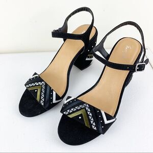 Mari A | 'Sloan' Embroidered Sandals Sz 8.5 NWOB. Black suede ankle strap sandal with chunky heel. Unique Aztec embroidery and studs on heel and front strap. 3.5” heel Please see photos for additional details.