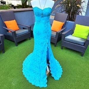 Mari Lee Strapless Lace Gown ✦ Ocean Blue Crystal Beaded Floor‑Length Prom Dress