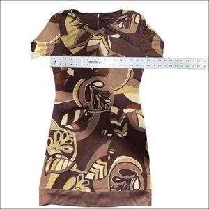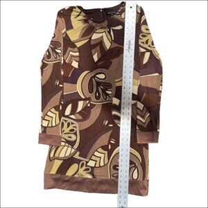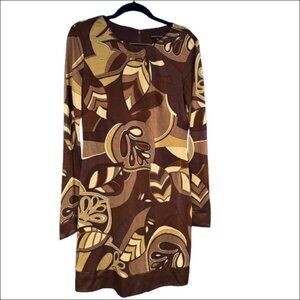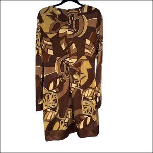 Brown floral with olive green, tan and cream accents. Projecting retro vibes with solid brown hems (sleeves and dress).