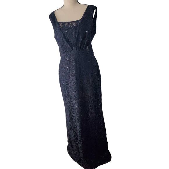 Maria Bonita Black Lace Sequin Party dress Sz L lace rose pattern, back zipper, see through the lace sides, lining.