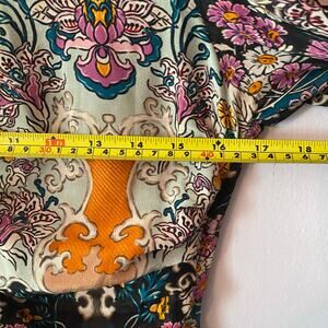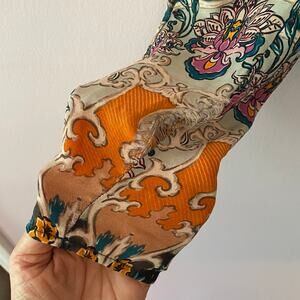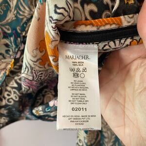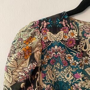 Maria Cher. Blue Purple Floral Abstract Blouse Rouched Cropped Silk size Large