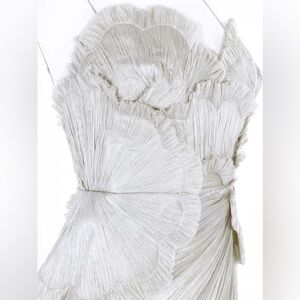 Made from a precious metallic silk chiffon, the ELLERY has a fitted bodice with intricate pleating, feminine spaghetti straps, and an asymmetrical draped skirt that's the perfect length to show off your favorite sandals.