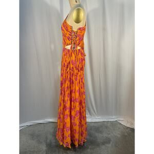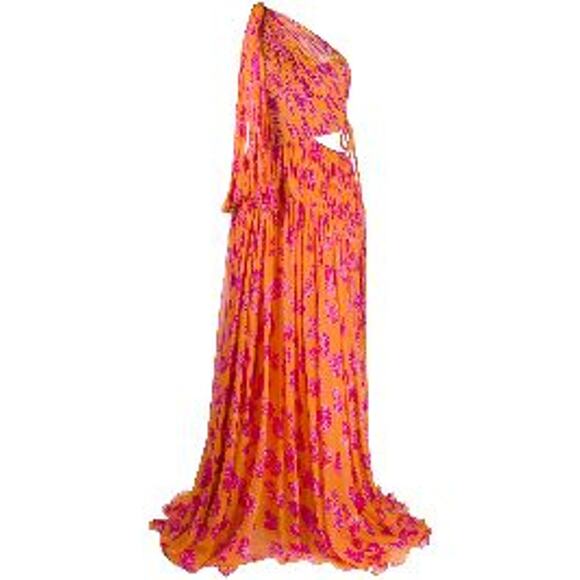 Maria Lucia Hohan 'Matilda' Orange Printed One-Shoulder Gown Size 4: a one shoulder design, draped details, cut out details, a side tie fastening, a flared skirt and printed pattern.