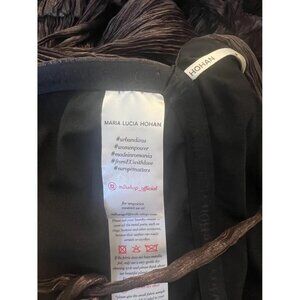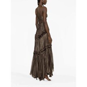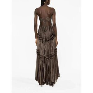 Maria Lucia Hohan employs premium fabrics and expert craftsmanship to create 'a story of strength and sensuality'. The Eris dress exemplifies that. Imagined in a rich, metallised brown hue, it is made from layers of gathered silk fabric. Its fitted, plunging V-neck bodice contrasts with the draped flowing skirt, which ends with an asymmetric ruffle hem at the ankle. Rows of ruffles punctuate the garment.