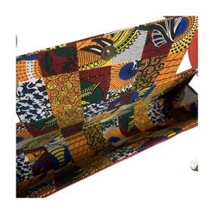 This stunning clutch purse from Maria Mateus adds a pop of color to any outfit. With its ruby red exterior and multicolor embroidered floral accents, it's a true statement piece. The clutch is made from a cotton blend with a knit fabric type and features a snap closure and a foldable design, making it easy to pack for travel or store when not in use. The purse is extra large in size, measuring 14 inches in width, 7 inches in height, and 4 inches in depth. It also comes with a matching multicolor pouch for storing small items. The hardware is gold in color with copper material, and the lining is made from multicolor fabric. This limited edition clutch is handmade and vintage, featuring a unique African print with a cottagecore colorblock design. It's perfect for a variety of occasions, including weddings, parties, and even casual outings.