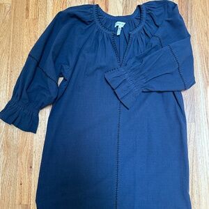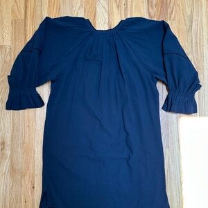 Raglan sleeves with elastic cuff, slit at sides, blanket stitch at the seams, 100% cotton, NWOT. Super cute navy sheath dress with black stitching. Bought final sale, only tried on at home and otherwise never worn. Unlined but not see-through.