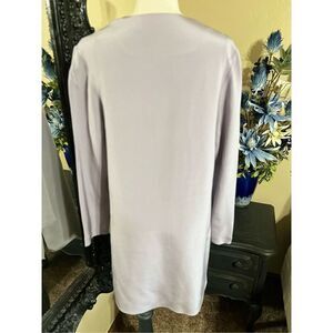 Stunning silk set that includes a sleeveless shell with long sleeve tunic shrug. Laying flat tank measures 18" from pit to pit, and 22" from shoulder to the hem. Shrug is 34" shoulder to hem and 25" sleeves. both pieces are gorgeous and 100% silk color is a pale lavender almost gray