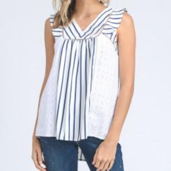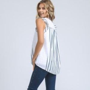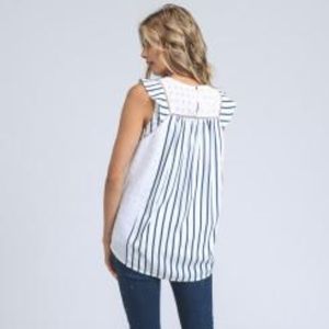 This tank features your favorite high low cut. It has super chic white and blue stripes and crochet detailing. Not to mention a little gold outline on the neckline. This tank is the perfect casual tank for warm and sunny days!