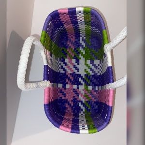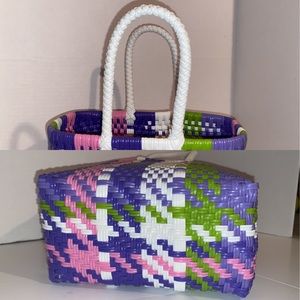 Details: open top Basket style Handbag, plaid pattern all around, 2 solid white pvc braided handles
