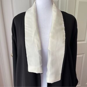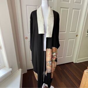 Maria Winner Material Things Vintage Fabric Silk Kimono Unique Designer Couture. A very rare find - An Upcycled Masterpiece by Maria Winner-Material Things! Open front long kimono robe/coat/duster, 3/4 cuffed sleeves. Black with white silk collar. Collar has an intentional uneven scarf effect. Inside lining on upper portion including through sleeves. Pockets on both side seams. Fabric and art are upcycled from authentic Japanese kimono fabrics. A stunning work of art!