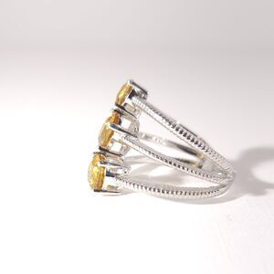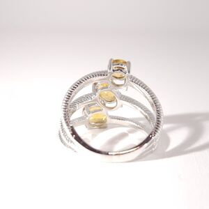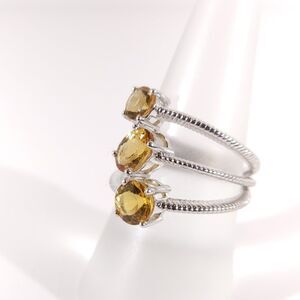 - The gemstones are described as: one 6 mm round faceted, one 7x5 mm oval faceted, and one 5 mm round faceted.
