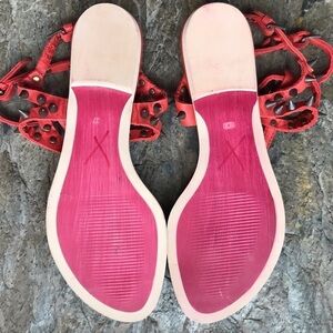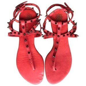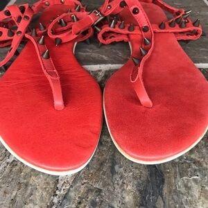 Good pre-owned condition! High quality edgy-glam scarlet red leather studded t-strap gladiator style sandals from Argentinian couture brand Marian Saud. Soft, flexible & adjustable straps with gunmetal studs and buckles at heel & ankle. Minor signs of wear include several indentations and slight creasing to insoles as well as scuffs/marks to outsoles. Euro size 37 - please see last picture for measurements to ensure best fit. Smoke-free/pet-free home!