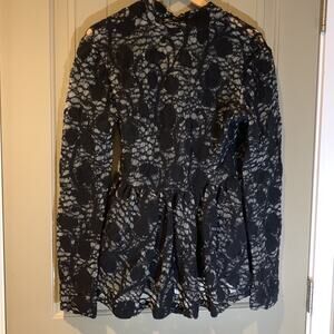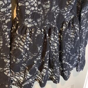 Long Sleeve Semi-Sheer Lace and Mesh Wrap Jacket top. Preowned. Unique with cobweb-like mesh throughout. Wrap with ribbon and button closure. Feminine silhouette. Size 3 (large). Silk and wool blend.