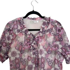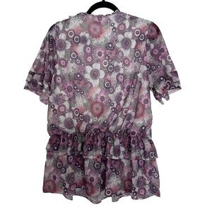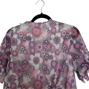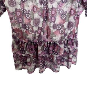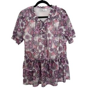 Purple and pink, floral blouse. Has tiered ruffle detail, flutter sleeves, and an elasticated dropped waist. Preowned but in good condition. Size M - L; listing as a medium