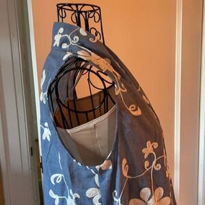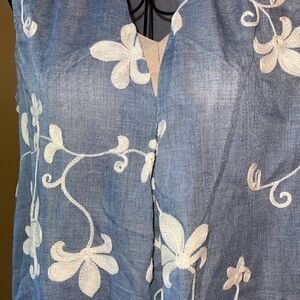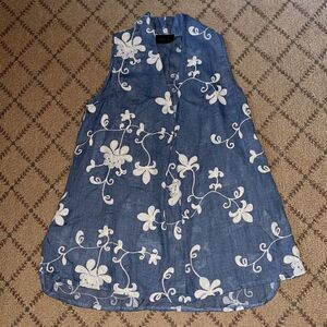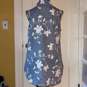 Mari flowy denim blue pullover blouse w white embroidered detail. NWOT S. Lightweight soft feel. V neck in front w an inverted pleat at the V. Standup collar in the back. Rounded hem w high low detail. Very cool and airy.
