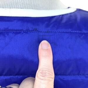A Marido Firenze blue goose down puffer jacket with ivory leather trim in a size 6. This designer jacket is in good to very good preowned condition showing some stains here and there to shell (see last three photos for most notable). Zoom in on photos for more detail. Some scuffs to leather here and there. Button cover fabric shows some wear on one sleeve (see photo). Price reflects condition. Made in Italy. Snap closure with exterior flap pockets.