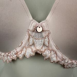 Combine the trendy look of a triangle bra with the comfort of a padded T-shirt bra, plus whimsical details and you get Leda! The irresistible padded bra with a rounded shape and gauzy tulle on the cups! This bra is the fit and comfort you love from Marie Jo with embroidered appliques on the straps. The shape is a nice in-between of the classic heart shape and balconette shape.