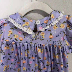 Nicole Miller toddler fall dress. Purple with floral pattern and ruffle sleeve and collar detail. Has button back with elastic closure for easy dressing.