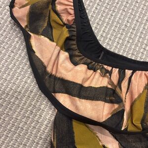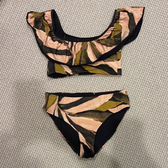 Trendy bikini set with ruffle details. Features a unique pattern in black, pink, and green.
