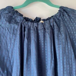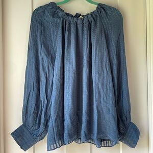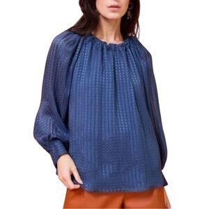 Description: gorgeous deep ink blue silk blend flowy top with a grid pattern, fitted cuffs— ballooning the sleeves, and a tie back neck.
