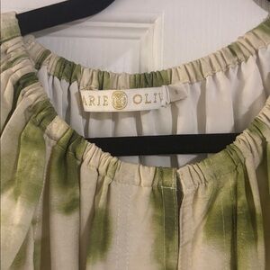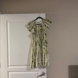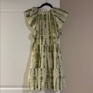 Stylish dress with a V-neckline. Features flutter sleeves. Green tie-dye pattern on cream fabric. Perfect for casual outings.