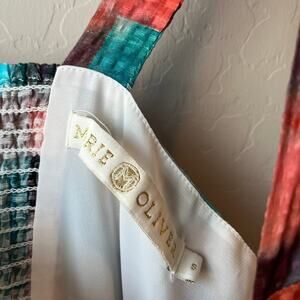 The Petra Dress from Marie Oliver featuring a sleeveless design in a vibrant madras plaid, geometric print. Straight shift midi silhouette with a flounce hem and a chic square neckline. Multicolor. Size small.