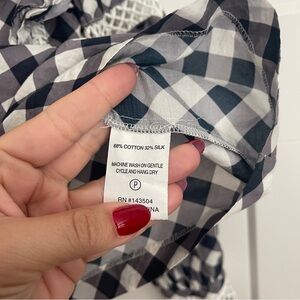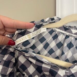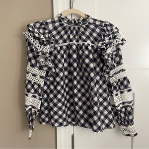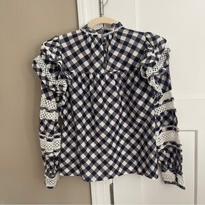 Marie Oliver Que Blue White Plaid Checkered Long Sleeve Ruffle Blouse