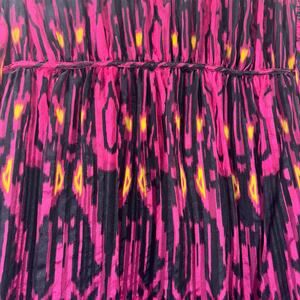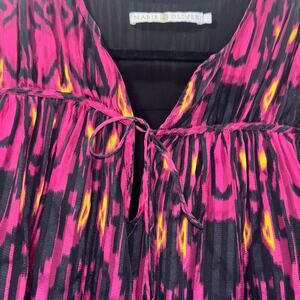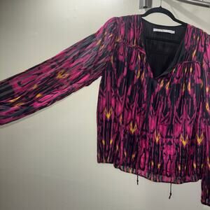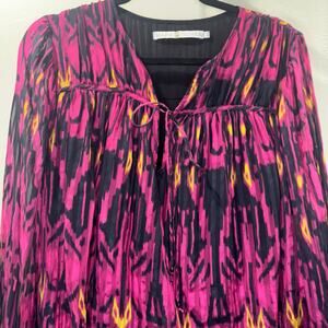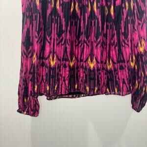 Elevate your wardrobe with this stunning Marie Oliver 100% silk blouse, featuring a bold pink, black, and yellow abstract ikat-inspired print. This flowy, lightweight top has a relaxed bohemian silhouette with long sleeves, elastic cuffs, and a tie-front neckline — perfect for pairing with jeans, trousers, or a skirt for an effortlessly chic look.