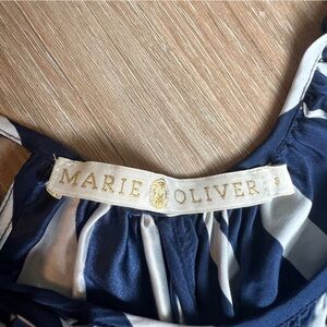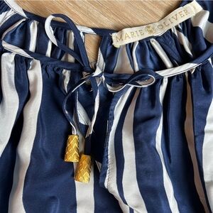 Keywords: Marie Oliver blouse, silky tie-neck top, patterned navy blouse, elevated workwear, statement blouse, dressy top small
