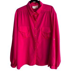 Marie-France Vintage Hot Pink Button-Up Palace Silk Roll Tab Sleeve Blouse 3XL