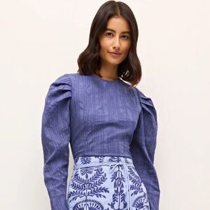 The marriage of color, texture, and pattern is a Marie Oliver hallmark, and Ingrid delivers—with plenty of romance and style to spare. Thanks to a crinkle cotton in saturated periwinkle, and a tailored, figure-flattering fit with statement details like structured shoulders and pleat detailing. Designed to tuck, pair Ingrid with complementary Sandra Skirt in Serenity, or pair back to your favorite jeans for an elevated casual look.