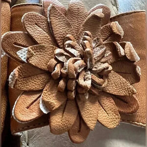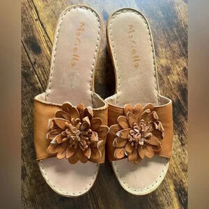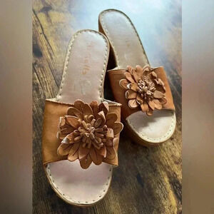 Womens slide on leather sandals. Wedge heel. The front of shoes has a leather daisy like flower (the backing is separated from some of the petals, see pictures, it looks to be a part of the shoe). Soft/cushioned insole. Plastic wedge heel. Good used condition. European shoe, made in Albania.