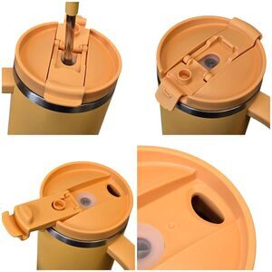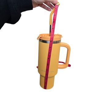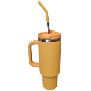 Yellow stainless steel tumbler with a handle and a straw. The tumbler has an engraved logo of "QQ NAILS & SPA" which is a chain of salons in New York City. It has a double-wall vacuum insulation to keep beverages hot or cold for extended periods. The lid is designed with a sliding closure to prevent spills. It includes a reusable straw, promoting sustainability. The tumbler is likely made of durable, rust-resistant stainless steel. It has a capacity of approximately 30-40 ounces, suitable for daily hydration needs.