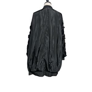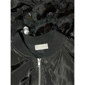 Hard to capture in pictures! Made of a polyester blend and has the feel of a raincoat. Features a netted lining, front zipper, fully sequin sleeves with ribbed cuffs and ribbed neckline. The bottom hem has some pleats in it to give it more of a tapered feel could be worn as a jacket or as a dress and is extremely oversized. Laying flat measures 29" from pit to pit, and about 30" shoulder to hem in the front, and 34" shoulder to hem in the back.
