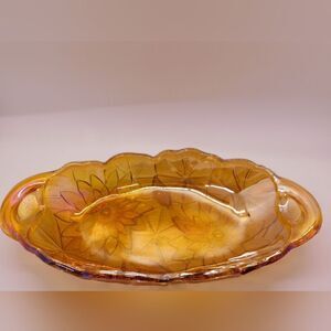 Pretty marigold colored carnival glass dish with sunflower pattern. No chips or cracks.