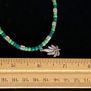 It's 4:20 somewhere! Whether you use marijuana for medicinal purposes or recreation, this necklace shows your love for this amazing plant. Many people associate the "pot" leaf with advocacy and social change. Additionally, for some, the leaf means personal liberties, the belief in a better day and the hope of a brighter world. This beautiful necklace proudly displays the marijuana leaf amid different shades of green seed beads and shining silver beads. The necklace measures @ 16.5 inches and fastens with a lobster claw clasp.