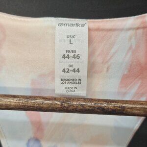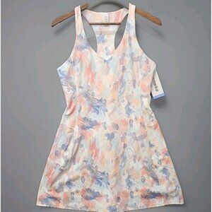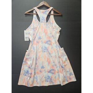 The Marika Active Women's Size L Coral Pink Multicolored Court Dress with a Racerback is a stylish and comfortable option for casual occasions. Made from a blend of polyester and spandex, this knee-length dress features a sleeveless design, a V-neckline, and a pullover closure. The abstract multicolor pattern adds a fun and colorful touch, while the racerback style gives it a sporty and athletic look. Machine washable and lightweight, this dress is perfect for summer, fall, and spring seasons, offering both stretch and pockets for convenience. Ideal for a variety of activities, this dress from Marika is a versatile addition to any woman's wardrobe.