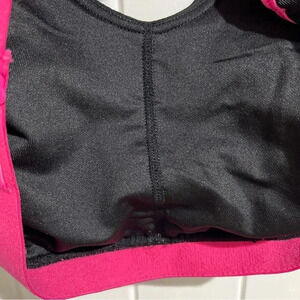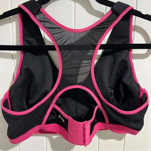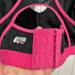 Bra is black with pink accents. Bra has a Mesh Racerback design across the back