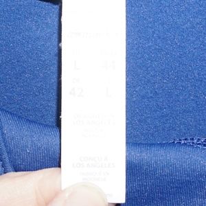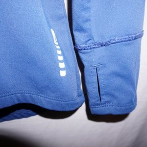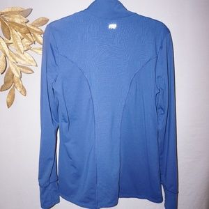 Marika Women's Long Sleeve Workout Top. Size Large. Asymmetrical Zipper at Collar. Thumbholes in sleeves. Navy blue with pattern in parts. Great condition.