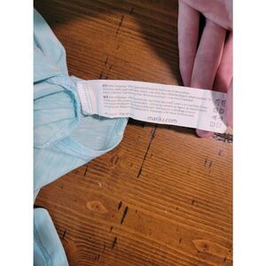 This is a static light baby blue Marika high-low muscle tee with a slit on each side. This top measures 25.5 inches from shoulder to front hem, 27.25 inches from shoulder to back hem, 17.5 inches from armpit to armpit, and 4 inches from neckline to the end of the sleeve. This top is preloved with no flaws.